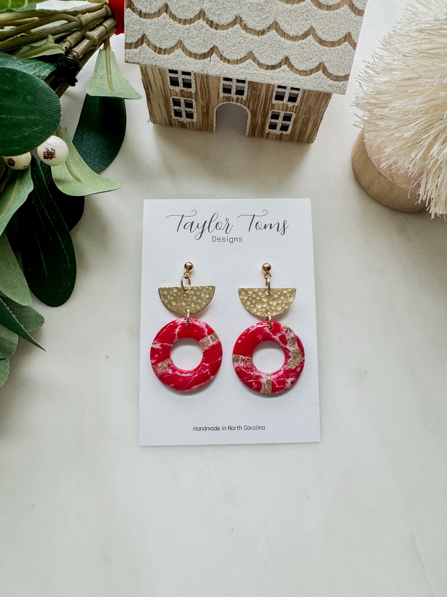 These earrings are perfect for Christmas! They are red with specks of gold and white. They are made of clay with a shiny finish. They are nickel free and very lightweight!