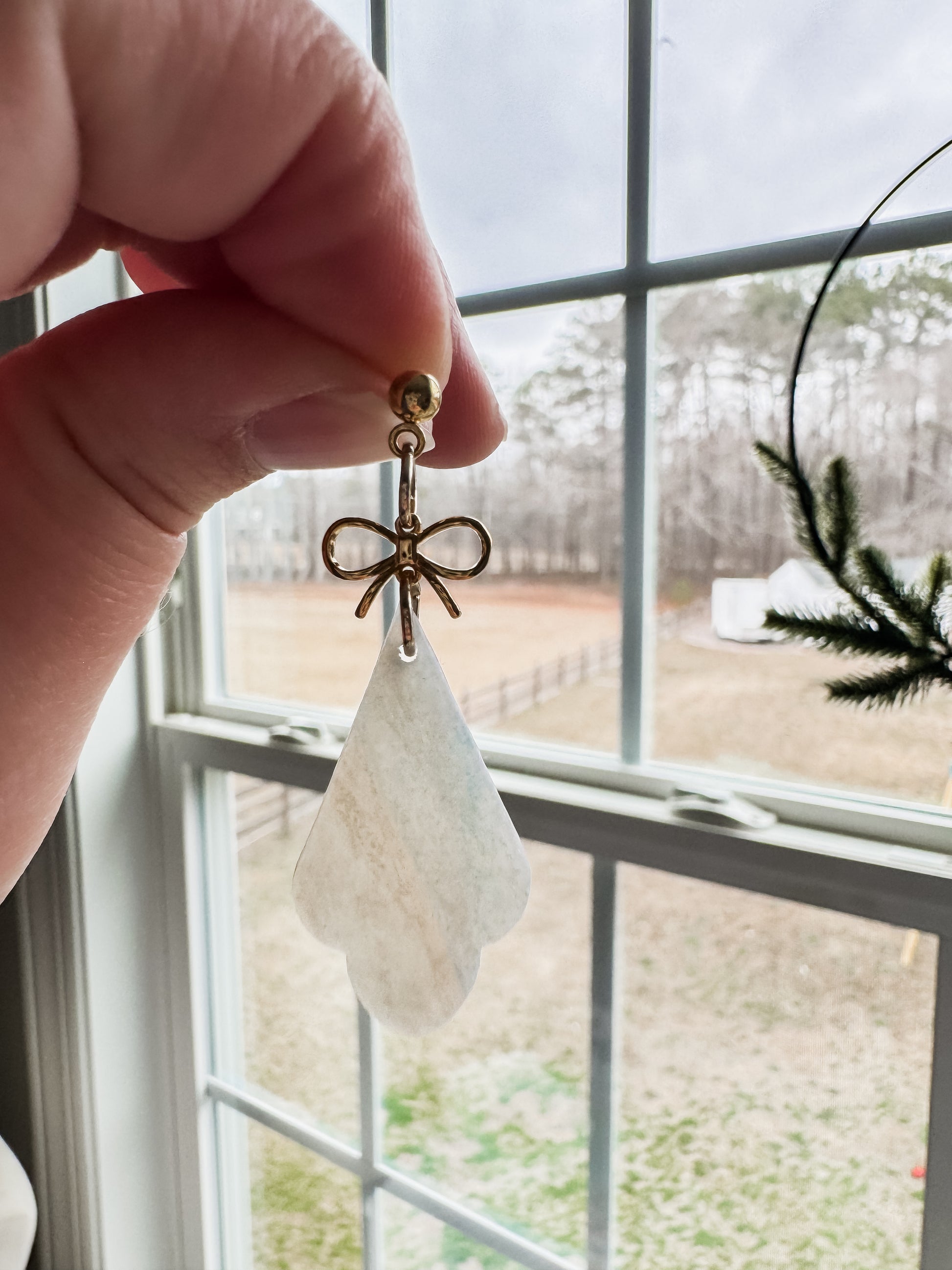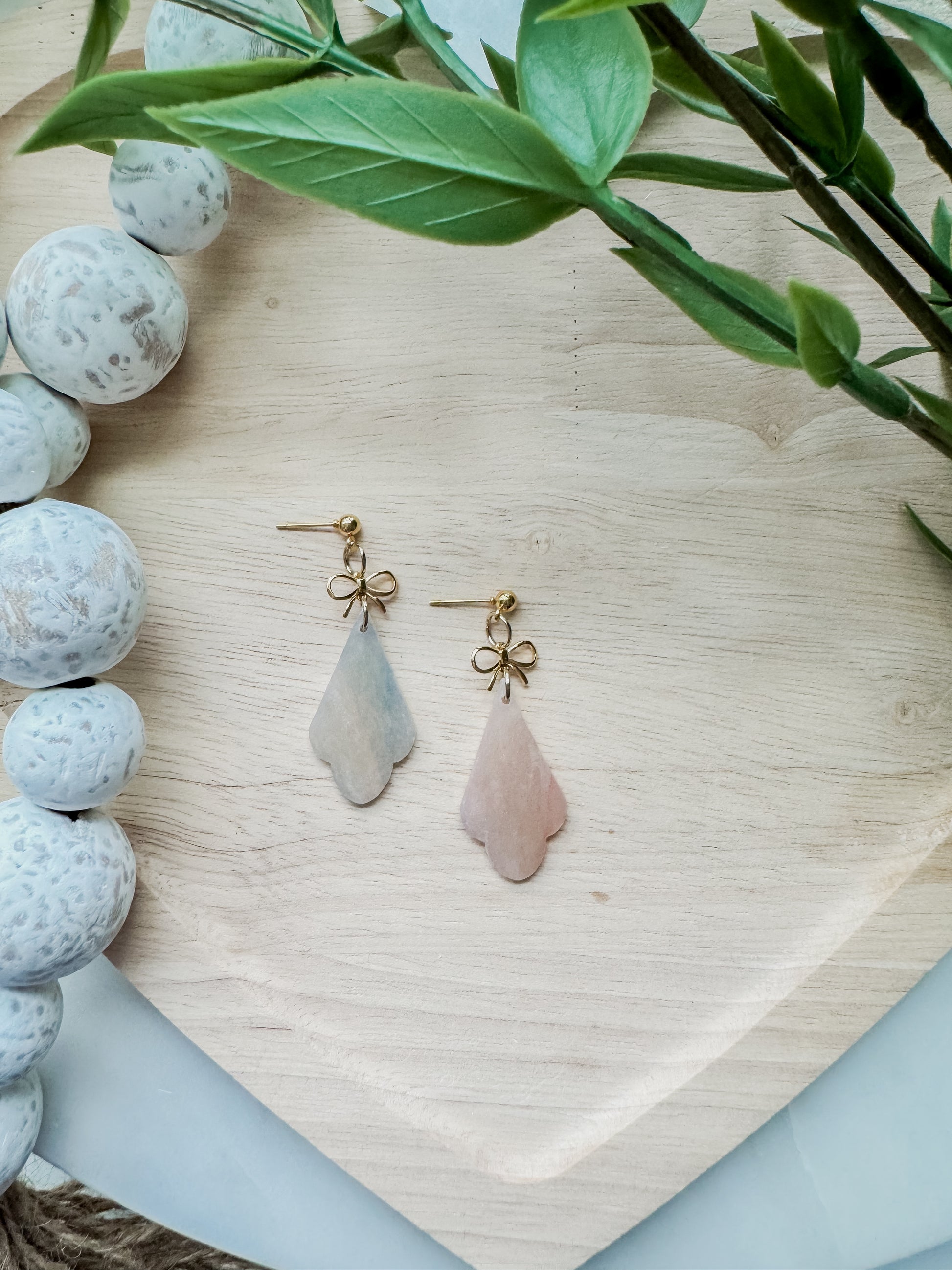 These earrings are perfect for spring and summer! They are translucent with pinks, gold, and touches of blue. These have a shiny finish. Since they are made of clay, they are nickel free and very lightweight!