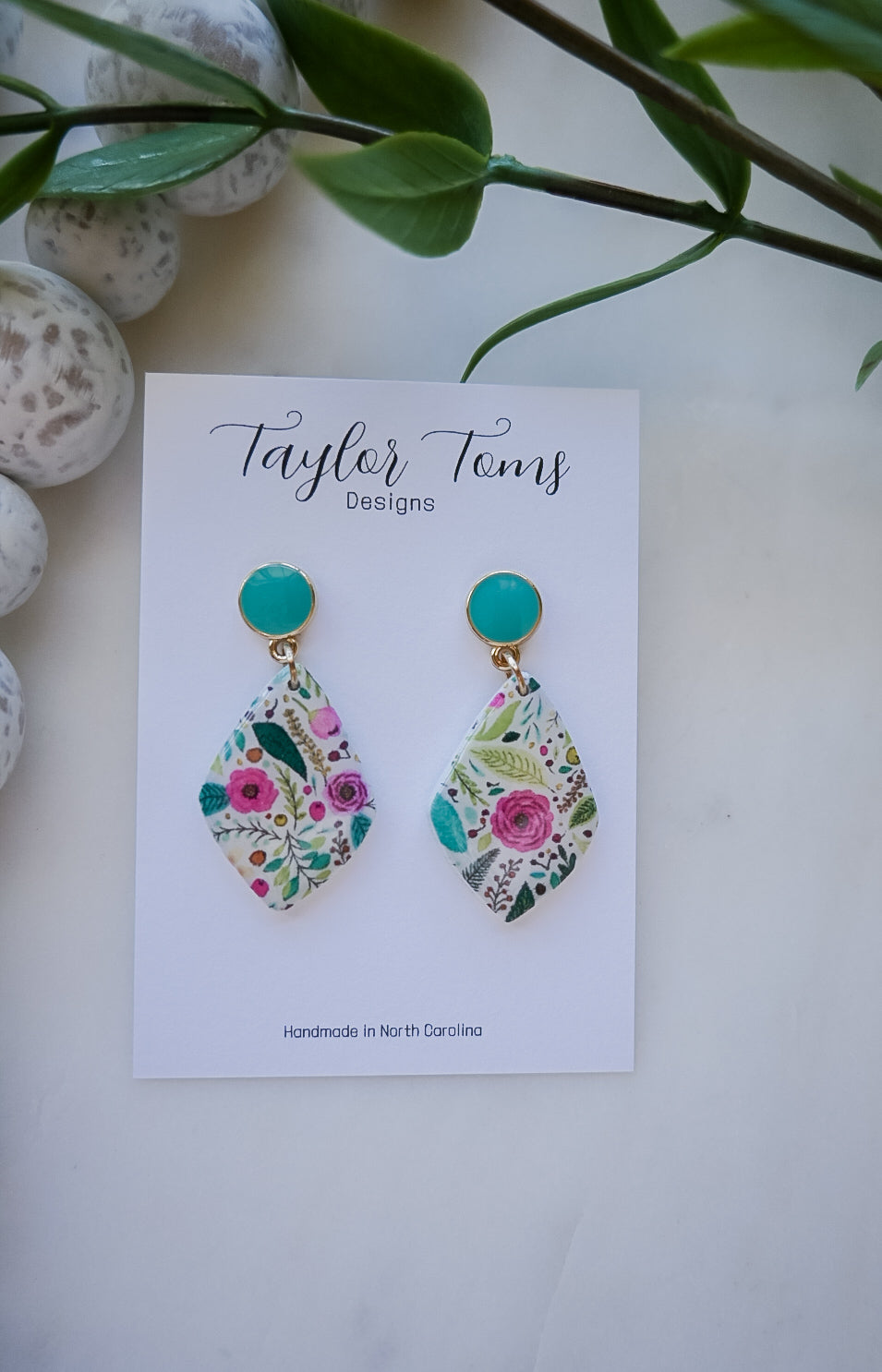These earrings are perfect for any occasion! They have the prettiest floral pattern with a shiny finish. Since they are made of clay, they are nickel free and very lightweight!