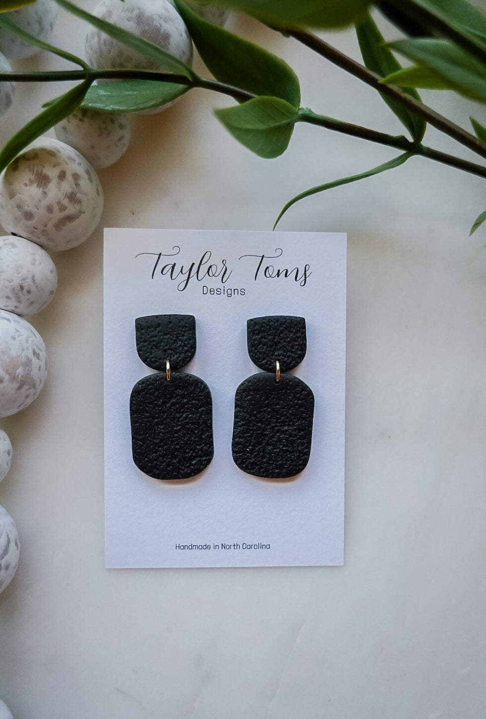 These earrings are perfect for any occasion! They are black with a hammered texture. Since they are made of clay, they are nickel free and very lightweight!