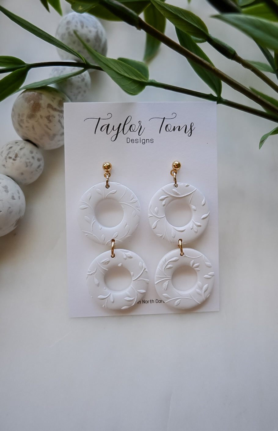 These earrings are perfect for any occasion! They are white with a leaf texture. Since they are made of clay, they are nickel free and very lightweight!