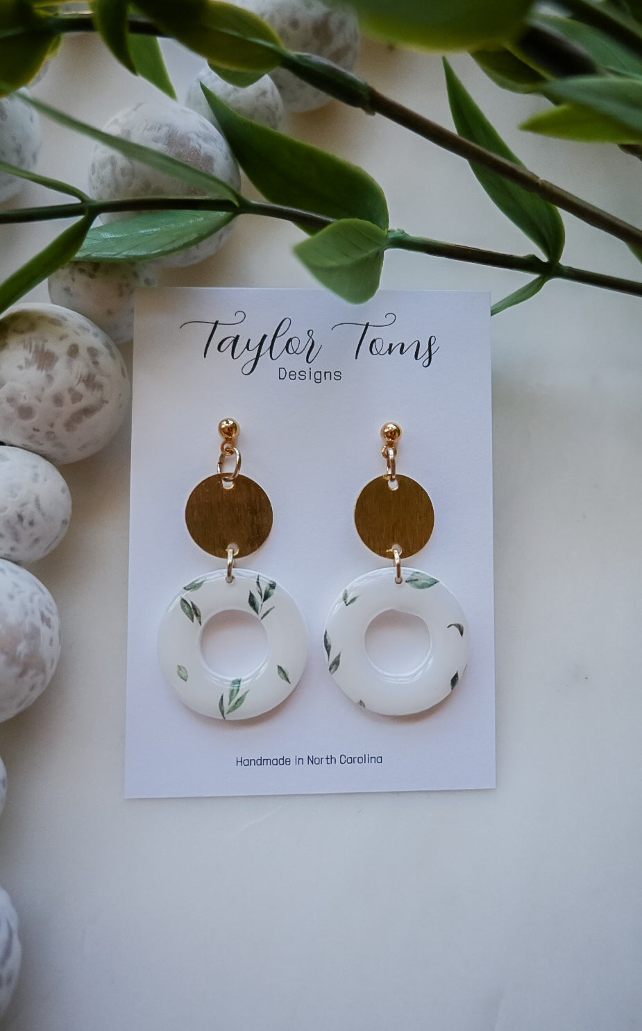 These earrings are perfect for any occasion! They are white with a leaf design and a shiny finish. Since they are made of clay, they are nickel free and very lightweight!